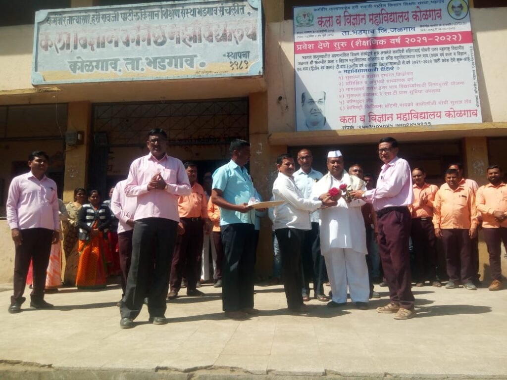कोळगाव ता-भडगाव – (प्रतिनिधी) कर्मवीर तात्यासाहेब हरि रावजी पाटील,किसान शिक्षण संस्था,भडगाव,संचलीत गोपीचंद पुना पाटील,विद्यालय व कनिष्ठ महाविद्यालय,कोळगाव ता.भडगाव येथे जळगाव जिल्हा मध्यवर्ती सहकारी बँकेचे संचालक तथा संस्थेचे चेअरमन आदरणीय नानासाहेब प्रतापराव पाटील यांना महाराष्ट्र राज्य शिक्षक समता परिषद,जळगावच्या वतीने शैक्षणिक व सामाजिक क्षेत्रातील योगदानाबद्दल तात्यासाहेब ज्योतिराव फुले समता पुरस्काराने सन्मानीत करण्यात आल्याबद्दल महाविद्यालयाचे प्राचार्य सुनिल पाटील व पर्यवेक्षक अनिल पवार यांच्याहस्ते सत्कार करण्यात आला.