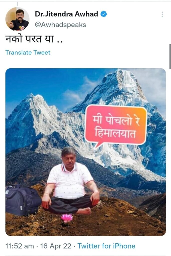 त्यावरच आता गृहनिर्माण मंत्री डॉ.जितेंद्र आव्हाड यांनी आपल्या ट्विटर अकाऊंटवरून चंद्रकांत पाटील हे हिमालयात पोहोचले असल्याचा एडिटेड फोटो पोस्ट केला आहे. ज्यात ‘मी पोहोचलो रे हिमालयात’ असं लिहिलेलं आहे. तर आव्हाड यांनी “नको परत या…” असं कॅप्शन या फोटोला दिलं आहे.