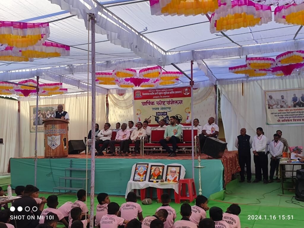 येथील विजय नाना पाटील आर्मी स्कुल आणि ज्युनिअर कॉलेज येथे ‘उत्सव आनंदाचा’ स्नेहसंमेलन नुकतेच उत्साहात साजरे करण्यात आले. त्यात विद्यार्थ्यांनी सांस्कृतीक कार्यक्रमातून उत्कृष्ट सादरीकरण केल्याने सर्वांचे लक्ष वेधून घेतले होते. सुरुवातीला संस्थेचे अध्यक्ष नानासाहेब विजय नवल पाटील, युवा उद्योजक अभिषेक पाटील यांच्यासह मान्यवरांना पथसंचलनाद्वारे मानवंदना देण्यात आली. यासाठी प्रभारी कमांडंट सुभेदार मेजर नागराज पाटील, सुभेदार मेजर श्रीराम पाटील, नायब सुभेदार भटू पाटील यांनी मार्गदर्शन केले. अध्यक्षस्थानी केंद्रीय मंत्री तथा संस्थेचे अध्यक्ष विजय नवल पाटील होते. सर्वप्रथम सरस्वतीचे पूजन होऊन रुक्मिणीताई आणि नवलभाऊ यांच्या प्रतिमेचेही पूजन करुन माल्यार्पण करण्यात आले. त्यानंतर दीप प्रज्ज्वलन करुन स्नेहसंमेलनाचे उद्घाटन झाले.