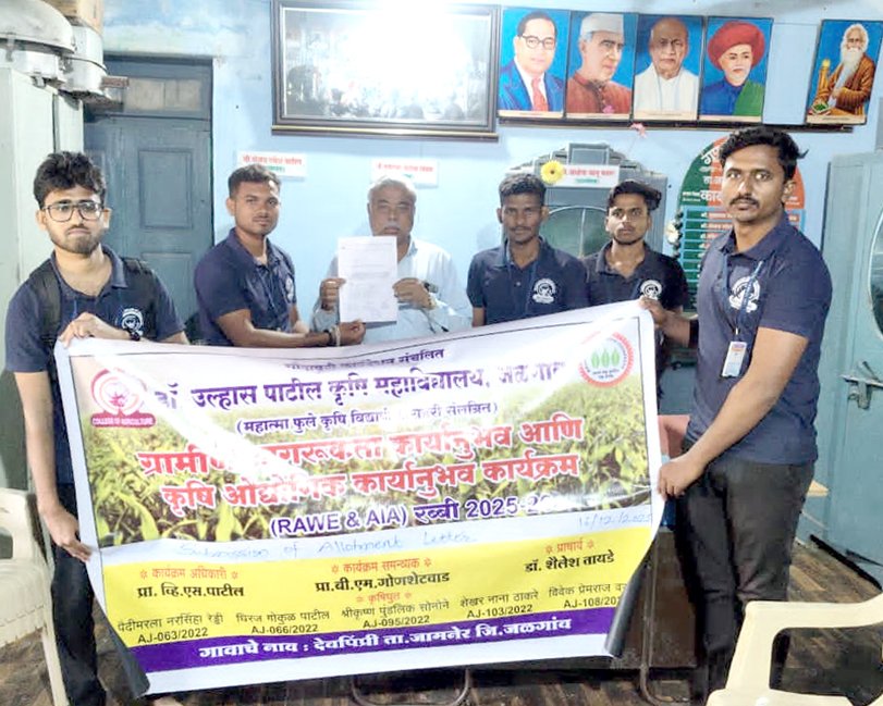 शेतकऱ्यांसाठी ग्रामीण जागरूकता कार्यानुभव कार्यक्रम (रब्बी) २०२५-२६ अंतर्गत जळगाव येथील डॉ. उल्हास पाटील कृषी महाविद्यालयाचे अंतिम वर्षाचे विद्यार्थी देवप्रिंपी गावात दाखल झाले.