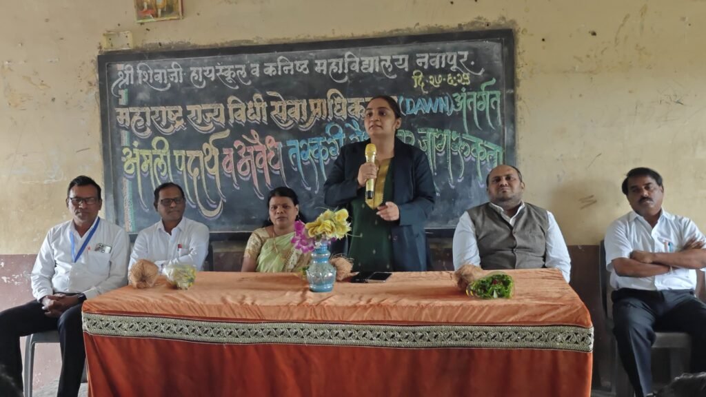 येथील श्री शिवाजी हायस्कूल व कनिष्ठ व महाविद्यालयात महाराष्ट्र राज्य विधी सेवा प्राधिकरण अंतर्गत अमली पदार्थ व अवैध तस्करी गैरप्रकार जागरूकता कार्यक्रम आयोजित केला होता. अध्यक्षस्थानी दिवाणी न्यायाधीश भाविका परमार होत्या. यावेळी सहदिवाणी न्यायाधीश धनंजय देवरे, नवापूर तालुका वकील संघाचे अध्यक्ष रामू वळवी, सचिव प्रदीपकुमार गावित, मुख्याध्यापिका कमल कोकणी, उपमुख्याध्यापक ए.एन.सोनवणे, पर्यवेक्षक हरीष पाटील, पर्यवेक्षक जी.डी.सूर्यवंशी उपस्थित होते. उपस्थित सर्व मान्यवरांचे पुष्पगुच्छ, श्रीफळ देऊन स्वागत करण्यात आले.