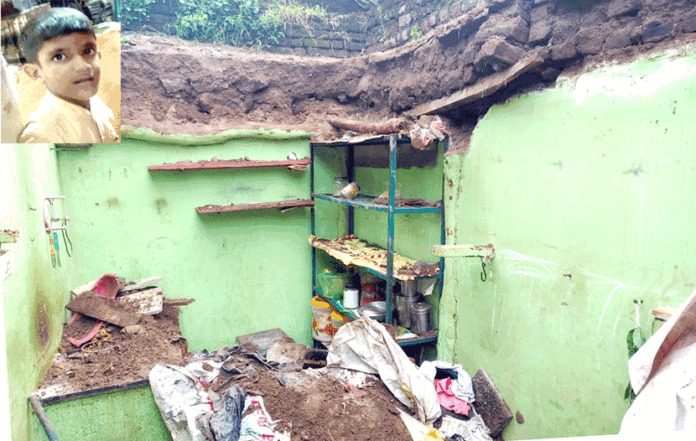 महेश नितिन राणे (वय १२) असे मयत झालेल्या बालकाचे तर योगेश बाळू पाटील असे जखमी झालेल्या बालकाचे नाव आहे. प्राप्त माहितीनुसार, विठ्ठल काशिनाथ पाटील हे आपल्या मुलासह धाब्याच्या घरात राहत होते. घराच्या मागच्या बाजूस महेश आणि त्याचा मावसभाऊ योगेश झोपले होते. घरातील इतर सदस्य पुढच्या भागात बसलेले होते. दुपारी सुमारे ३ वाजेच्या सुमारास घराच्या मागचा भाग कोसळल्याने जोरदार खळबळ उडाली. विठ्ठल पाटील आणि चंद्रकांत पाटील यांनी तात्काळ गल्लीतील नागरिकांना बोलावून पडलेली माती व लाकडे बाजूला करण्यास सुरुवात केली. या प्रयत्ना दरम्यान महेश आणि योगेश यांना बाहेर काढण्यात आले. त्यांना त्वरित ग्रामिण रुग्णालयात उपचारासाठी आणले असता डॉक्टरांनी महेश राणे याचा मृत्यू झाल्याचे घोषित केले. तर योगेश पाटील जखमी झाला असून त्याच्यावर उपचार सुरू आहे.