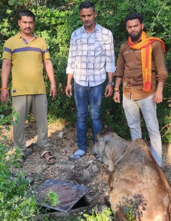 त्यांनी तात्काळ याबाबत बजरंग दलाच्या कार्यकर्त्यांना माहिती दिली. क्षणाचाही विलंब न करता बजरंग दलाचे कार्यकर्ते मनोज चौधरी व डॉ. विशाल देवरे यांनी घटनास्थळी धाव घेतली. पोलिस कर्मचारी संदीप सातपुते व भुषण पाटील यांच्या मदतीने शौचखड्ड्यात अडकलेल्या गोवंशाचे सुरक्षितरित्या रेस्क्यू करण्यात आले.