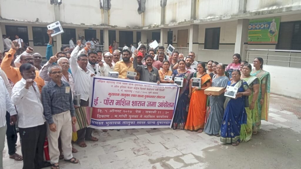 भुसावळ तालुका स्वस्त धान्य दुकानदार संघटना यांच्यावतीने सोमवारी, ५ ऑगस्ट रोजी ‘ई-पोस मशीन जमा करो’ आंदोलन करून तहसीलदार निता लबडे यांना निवेदन देऊन पुरवठा विभातील गुरव यांच्याकडे भुसावळ तालुक्यातील ई पोस मशीन जमा करण्यात आल्या. सर्व्हर समस्या लवकर सोडण्यात यावी, अशी मागणीही स्वस्त धान्य दुकानदारांनी केली.