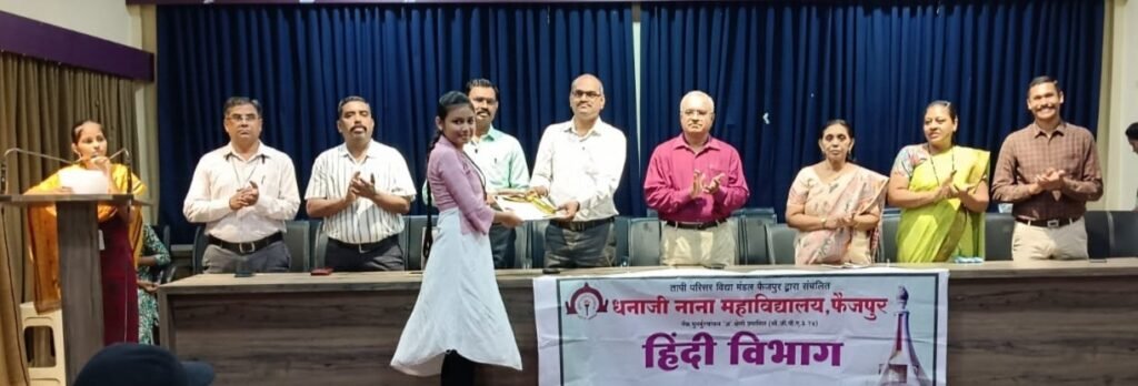 येथील धनाजी नाना महाविद्यालयात हिंदी विभागतर्फे ‘हिंदी दिना’ निमित्त आयोजित ‘हिंदी सप्ताह’ चा समारोप समारंभात बक्षीस वितरण करण्यात आले. दरवर्षीप्रमाणे हिंदी विभागातर्फे हिंदी सप्ताहानिमित्त सात दिवस निबंध, रांगोळी, मेहंदी, वादविवाद, चित्रकला, काव्यवाचन व सामान्य ज्ञान अशा विविध सात स्पर्धां घेण्यात आल्या होत्या. सर्व स्पर्धात कनिष्ठ आणि वरिष्ठ महाविद्यालयातील जवळपास तीनशे विद्यार्थ्यांनी सहभाग नोंदविला होता. त्यापैकी ३५ यशस्वी विद्यार्थ्यांना प्रत्येक स्पर्धेत प्रथम, द्वितीय, तृतीय व उत्तेजनार्थ पारितोषिकसाठी निवड केली होती. सर्व यशस्वी विजेत्या विद्यार्थ्यांचा ‘समारोप समारंभात’ पारितोषिक वितरणाचा कार्यक्रम घेऊन गौरव करण्यात आला.