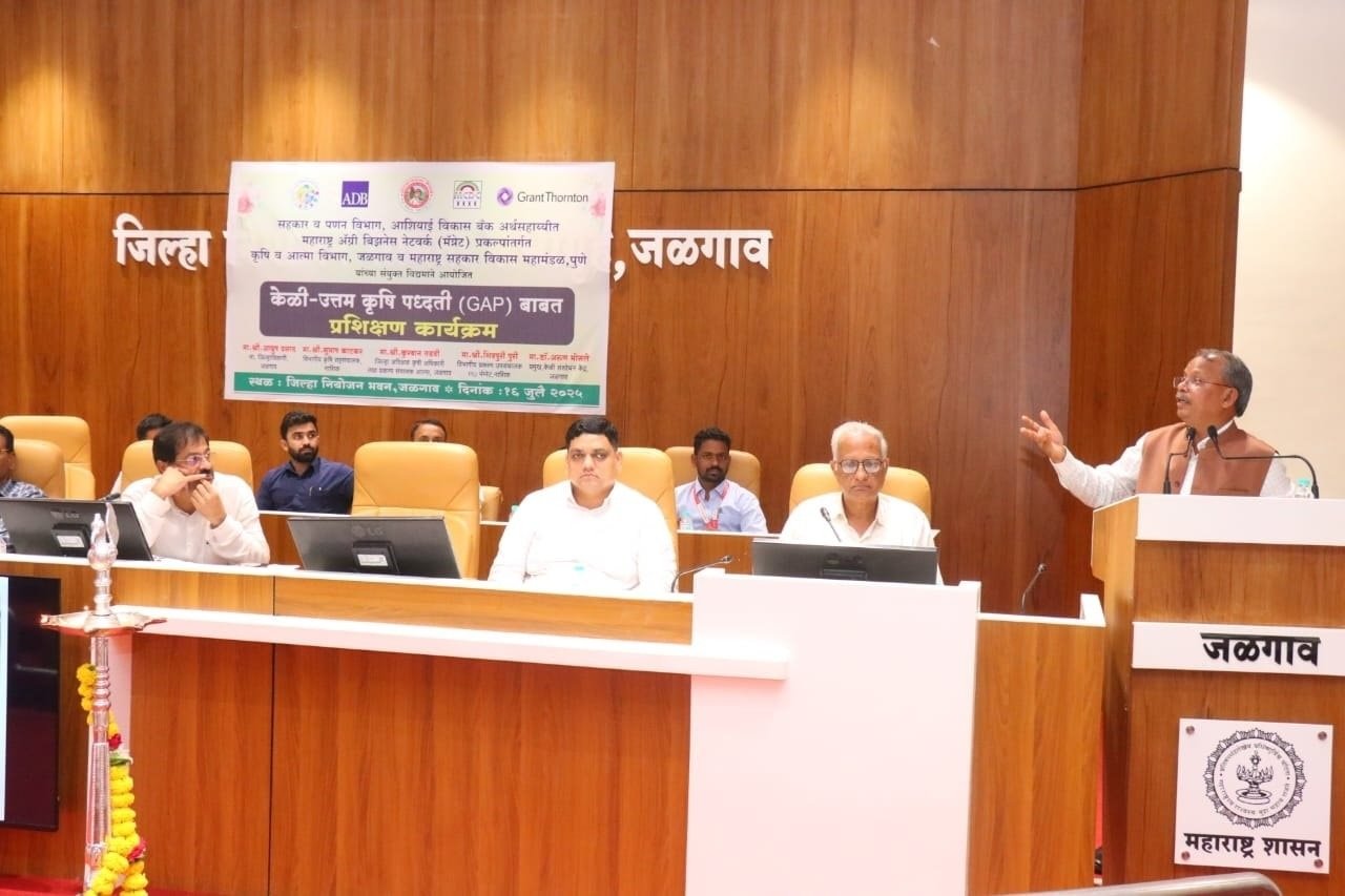 जिल्हाधिकारी कार्यालयातील जिल्हा नियोजन भवनात जळगावात ‘केळी–उत्तम कृषी पद्धतीबाबत प्रशिक्षण कार्यक्रम’ पार पडला. हा कार्यक्रम सहकार व पणन विभाग तसेच आशियाई विकास बँक अर्थसहाय्यित महाराष्ट्र ग्रीन बिझनेस नेटवर्क प्रकल्पांतर्गत आयोजित केला होता. कार्यक्रमाचे आयोजन जळगाव कृषी व आत्मा विभाग आणि पुणे महाराष्ट्र सहकार विकास महामंडळ यांच्या संयुक्त विद्यमाने केले होते. प्रशिक्षण कार्यक्रमात प्रगतशील शेतकरी, महिला बचत गट, कृषी महाविद्यालयीन विद्यार्थी आणि कृषीविषयक आवड असणारे नागरिक मोठ्या संख्येने सहभागी झाले होते. कार्यक्रमामुळे निर्यातक्षम केळी लागवडीसाठी शेतकऱ्यांना नवी दिशा मिळाली आहे.