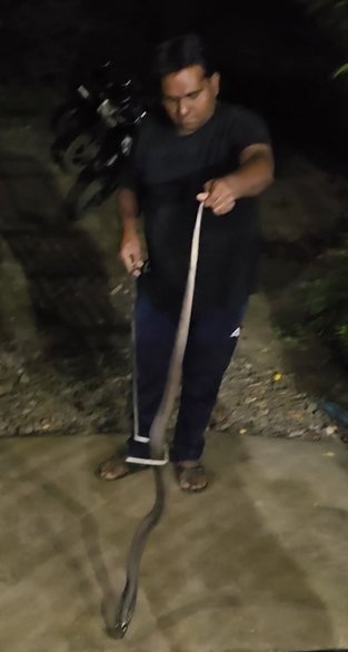 जळगाव शहरातील हरीविठ्ठल नगर भागातील व्यकंटेश नगरातील रहिवासी तथा सर्पमित्र राजेश सोनवणे यांना रात्री ११ वाजेच्या सुमारास ‘दादा, आमच्या घरात साप शिरला आहे, तुम्ही लवकर या…’ असा भ्रमणध्वनीवरुन निरोप मिळाला होता. तेव्हा ते विनाविलंब कोल्हे हिल्स परिसरातील श्रीराम चौकातील ज्ञानेश्वर विसावे यांच्या निवासस्थानी पोहोचले. त्यांच्या घरातील हॉलच्या दरवाजाच्या पाठीमागे नाग जातीचा भला मोठा साप अक्षरश: फणा काढून बसला होता. अशावेळी सर्पमित्र राजेश सोनवणे यांनी त्यांच्या घरी पोहचून नाग जातीच्या सापाला सुरक्षितरित्या पकडले. घरातील सर्व परिवाराची मनातली भीती काढली. त्यानंतर परिवाराने सुटकेचा नि:श्वास सोडला. तेथील लोकांना मार्गदर्शन करून सापाविषयी असणाऱ्या भीतीसह गैरसमज दूर केले. पकडलेला विषारी नाग जातीचा साप सुरक्षितरित्या जंगलात सोडल्याचे सर्पमित्र राजेश सोनवणे यांनी सांगितले.