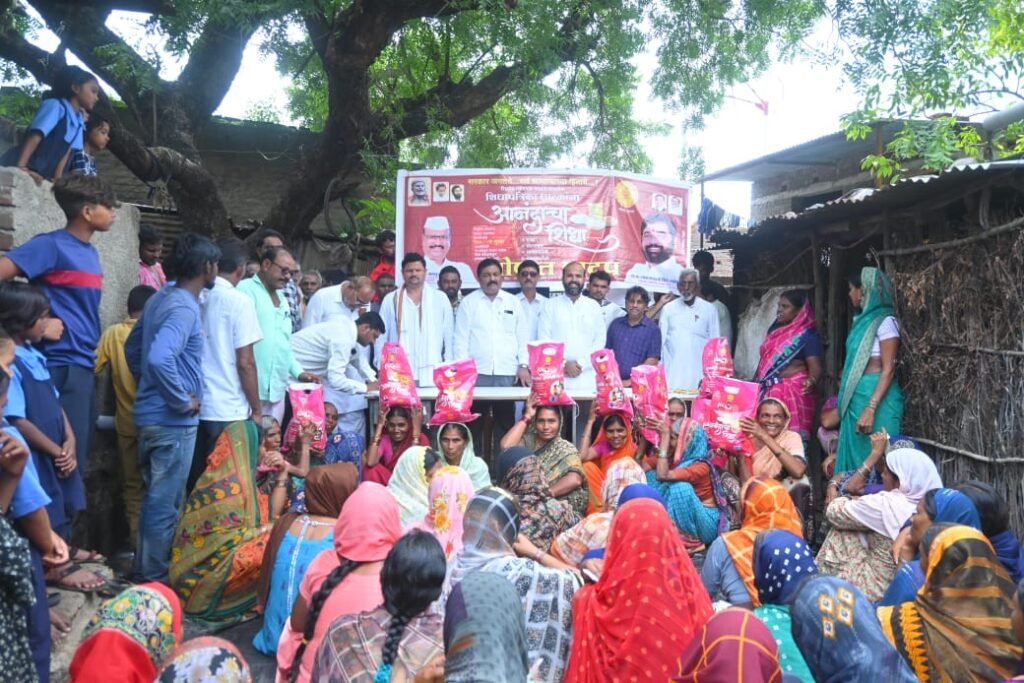 आनंद शिधासाठी लागणारे १०० रुपये शुल्क पालकमंत्री अब्दुल सत्तार मित्र मंडळाच्यावतीने भरण्यात आले. त्यामुळे सोयगावच्या ३८ स्वस्त धान्य दुकान अंतर्गत १३ हजार ६०० लाभार्थ्यांना गावोगावी माजी नगराध्यक्ष अब्दुल समीर यांच्याहस्ते व शिवसेना पदाधिकाऱ्यांच्या प्रमुख उपस्थितीत आनंद शिधा वाटप करण्यात येत आहे. त्यासोबतच महाराष्ट्र इमारत व इतर बांधकाम कामगार मंडळ अंतर्गत नोंदणीकृत कामगारांना गृहपयोगी साहित्य भांडेचे वाटप मान्यवरांच्या हस्ते करण्यात आले.