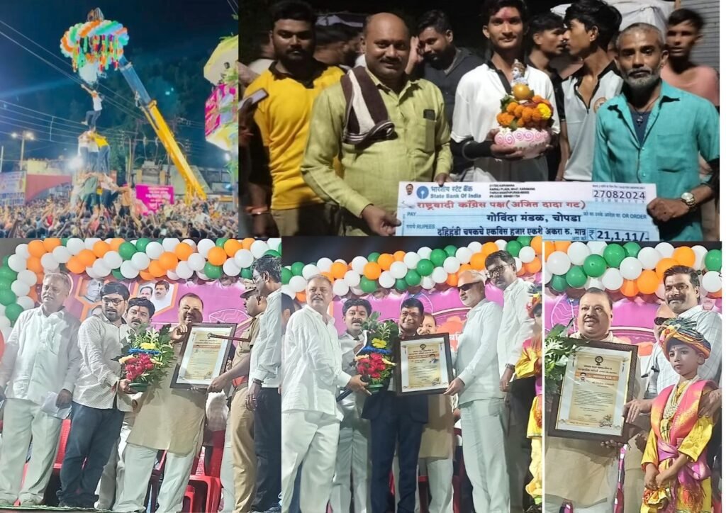 चोपडा शहर सामाजिक, सांस्कृतिक समितीतर्फे आणि राष्ट्रवादी काँग्रेस (अजितदादा गट) पक्षातर्फे कृष्ण जन्माष्टमी व गोपाळकालानिमित्त मंगळवारी, २७ ऑगस्ट रोजी येथील गांधी चौकात जोशपूर्ण वातावरणात दहीहंडीचे आयोजन केले होते. दहीहंडी विजेत्या पथकास राष्ट्रवादी काँग्रेसकडून रोख रक्कम २१ हजार १११ रुपयांचे बक्षीस ठेवण्यात आले होते. त्यात विशाल भाऊ युवा मंच, रामपुरा मंडळ, अरुण नगर मंडळ, दारा क्लब सुंदरगढी, क्रांतीवीर समशेर सिंग मंडळ, न्यू एकता मंडळ, महादेव गणेश मंडळ, शिवदाम मंडळ, शिवबा स्पोर्ट अकॅडमी मंडळ, माँ शेरावाली मंडळ, फुलेनगरचा राजा मंडळ अशा शहरातील ११ गोविंदा पथकांनी सहभाग घेतला होता. जमिनीपासून २१ फूट उंच असलेली दहीहंडी अरुण नगरातील न्यू एकता मंडळाने चार मनोरे लावून पवन सुनील पाटील ‘गोविंदा’ ठरला. त्याने हवेत जोशपूर्ण उडी मारून दहीहंडी फोडल्याबरोबर कार्यक्रमात सहभागी असलेल्या प्रेक्षकांनी एकच जल्लोष केला. विजयी पथकाने २१ हजार १११ रुपयांचे बक्षीस प्रायोजकाकडून स्वीकारले. याच मंडळाने क्रमाने सतत तीन वर्ष सलग दहीहंडी फोडण्याचा विक्रम कायम ठेवला. अध्यक्षस्थानी माजी आमदार जगदीशचंद्र वळवी होते. प्रमुख पाहुणे म्हणून माजी आमदार कैलास पाटील उपस्थित होते.