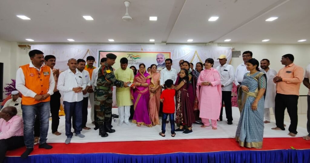 स्वातंत्र्याच्या अमृत महोत्सवानिमित्त पंतप्रधान नरेंद्र मोदीजी यांच्या “हर घर तिरंगा”उपक्रमांतर्गत अमळनेर येथे भारतीय जनता पार्टी तर्फे देशाचे आजी माजी सैनिक आणि वीर माता व वीर पत्नींचा आणि दिव्यांग यांचा तिरंगा राष्ट्रध्वज व गुलाबपुष्प देऊन विशेष असा सन्मान करण्यात आला.