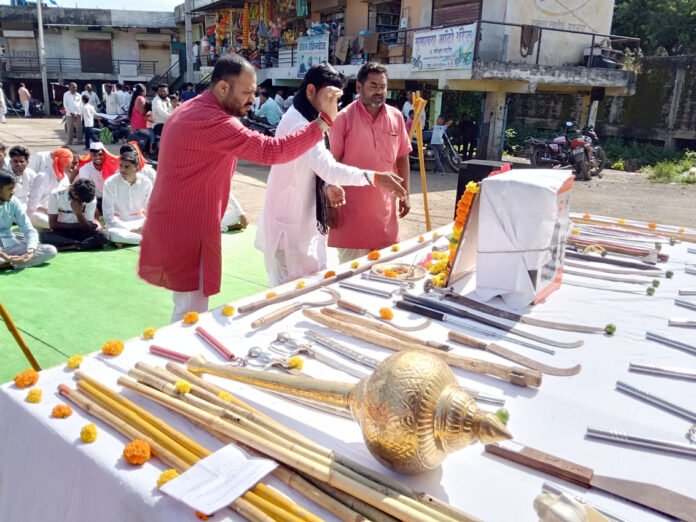 विजयादशमी निमित्त हिंदू जनजागृती समितीच्या वतीने शौर्य जागरण शस्त्र पूजन कार्यक्रम पार पडला. समिती सेवकांनी पारंपरिक शस्त्रांचे शास्त्रोक्त पद्धतीने पूजन करून विधी संपन्न केला.