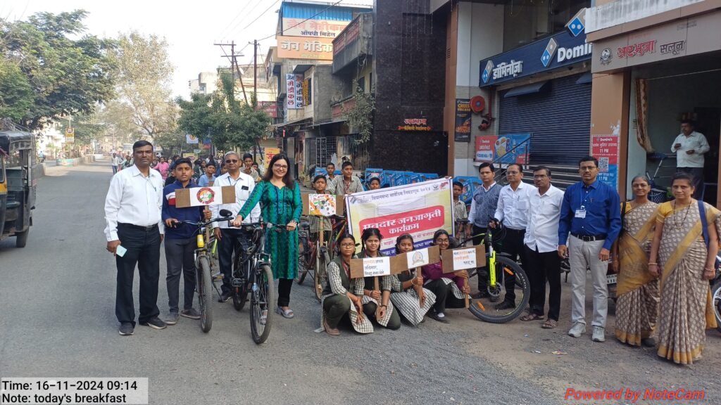 प्रत्येक मतदाराने आपल्या मतदानाचा हक्क बजवावा, यासाठी मतदार जागरूकता व सहभाग अभियानांतर्गत विद्यार्थ्यांनी सायकल रॅली काढली. ही रॅली सायकलवर मतदार जनजागृतीचे फलक लावून भुसावळ शहराच्या गल्लीबोळातून काढण्यात आली. २० नोव्हेंबर रोजी होणाऱ्या विधानसभा निवडणुकीत मतदानाची टक्केवारी वाढवून लोकशाही बळकट करण्यासाठी निवडणूक आयोगाने दिलेल्या सूचनेनुसार मतदार जनजागृती अभियानांतर्गत सायकल रॅली काढण्यात आली. रॅलीत महाराणा प्रताप विद्यालय व अहिल्यादेवी विद्यालयातील विद्यार्थ्यांचा सहभाग होता. सायकल रॅलीचा शुभारंभ महाराणा प्रताप विद्यालयाचे मुख्याध्यापक सुरेश शिंदे यांच्या हस्ते करण्यात आला. यावेळी स्वीप सहाय्यक अधिकारी राहूल पाटील, स्वीप सहाय्यक अधिकारी प्रमोद आठवले, स्वीपचे युथ आयकॉन शिक्षणतज्ज्ञ डॉ. जगदीश पाटील, वैभव पुराणिक, सुधाकर सपकाळे, आशिष निरखे, कोमल जोशी, वंदना ठोके यांच्यासह शिक्षकांची उपस्थिती होती.