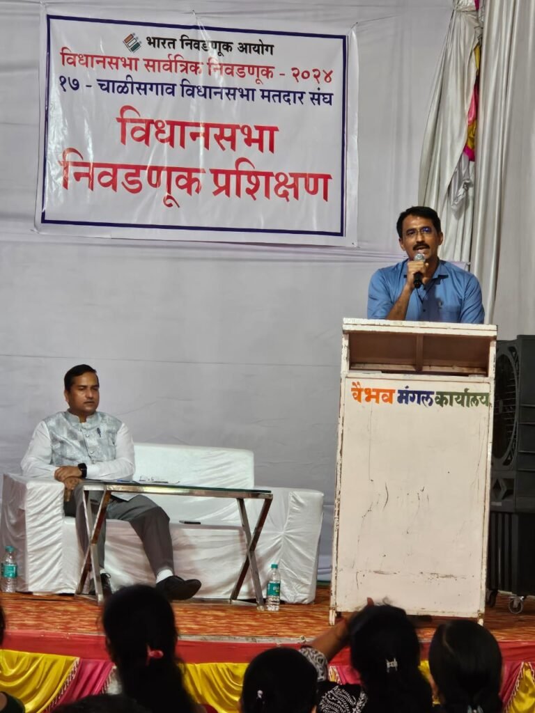 आगामी विधानसभा सार्वत्रिक निवडणुकीसाठी आदर्श आचारसंहितेची अंमलबजावणी सुरू झालेली आहे. त्यासाठी १७ चाळीसगाव विधानसभा मतदारसंघात २२ ऑक्टोंबरपासून अर्ज दाखल करावयाचे कामकाज सुरू झालेले आहे. ही निवडणूक प्रक्रिया सुरळीतपणे पार पाडण्यासाठी मतदान केंद्रावरील मतदान केंद्राध्यक्ष आणि मतदान अधिकारी यांचा प्रथम प्रशिक्षण वर्ग २७ ऑक्टोबर रोजी भडगाव रस्त्यालगतच्या वैभव मंगल कार्यालय येथे निवडणूक निर्णय अधिकारी प्रमोद हिले, तहसीलदार चाळीसगाव तथा सहाय्यक निवडणूक निर्णय अधिकारी प्रशांत पाटील, सहाय्यक निवडणूक निर्णय अधिकारी प्रथमेश मोहोड यांच्या अध्यक्षतेखाली आयोजित केला होता. हा प्रशिक्षण वर्ग सकाळी ९ ते १ आणि दुपारी २ ते ६ अशा दोन सत्रात पार पडला. सकाळच्या सत्रात ४१८ मतदान केंद्राध्यक्ष आणि ४१९ प्रथम मतदान अधिकारी अशा ८३७ मतदान अधिकारी यांना प्रशिक्षण देण्यात आले. दुसऱ्या सत्रात ४२१ पुरुष आणि ६४४ महिला असे एक हजार ६५ इतर मतदान अधिकारी यांना प्रशिक्षण देण्यात आले.