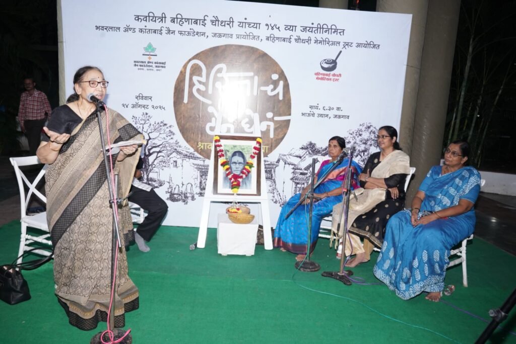 ‘निसर्गकन्या’ म्हणून प्रसिद्ध असलेल्या बहिणाबाईंच्या ओव्या आजही जनमानसात जीवंत आहेत. त्यांच्या काव्य साहित्यातून श्रमजीवी जीवन, निसर्गाचे सौंदर्य, स्त्रियांचे भावविश्व आणि ग्रामीण संस्कृती यांचे प्रतिबिंब ‘हिरिताचं देनं घेनं’ श्रावण काव्यसंध्येत उमटले. बहिणाबाई चौधरी मेमोरियल ट्रस्ट व भवरलाल ॲण्ड कांताबाई जैन फाऊंडेशनच्यावतीने कवयित्री बहिणाबाई चौधरी यांच्या १४५व्या जयंतीनिमित्त ‘हिरिताचं देनं घेनं’ विशेष कार्यक्रमाचे आयोजन केले होते. ही श्रावण काव्यसंध्या भाऊंचे उद्यान येथे पार पडली. अध्यक्षस्थानी बहिणाईंच्या पणत सून स्मिता चौधरी उपस्थित होत्या.