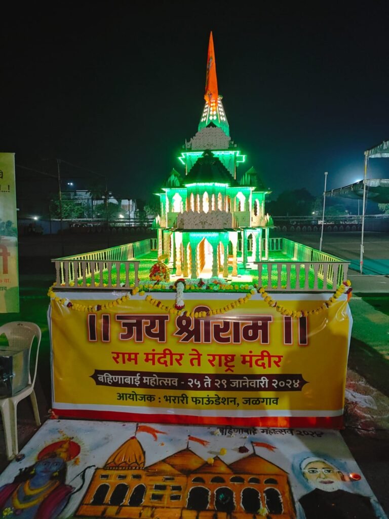 भरारी फाउंडेशनतर्फे येत्या गुरुवारी, २५ जानेवारीपासून आयोजित करण्यात येत असलेल्या बहिणाबाई महोत्सवाचे भूमिपूजन सोमवारी, २२ जानेवारी रोजी सायंकाळी उद्योगपती रजनीकांत कोठारी यांच्या हस्ते करण्यात आले. यावेळी अयोध्या येथील श्रीरामांच्या प्राणप्रतिष्ठेचे औचित्य साधून महोत्सवाच्या स्थळी राम मंदिराची प्रतिकृती साकारली आहे. ते नागरिकांचे विशेष आकर्षण ठरत आहे. भूमिपूजननिमित्त श्रीरामाची ‘महाआरती’ झाली. यावेळी क्षत्रिय वर्मा समाजातील कलाकारांनी सांस्कृतिक कलांचे सादरीकरण केले.