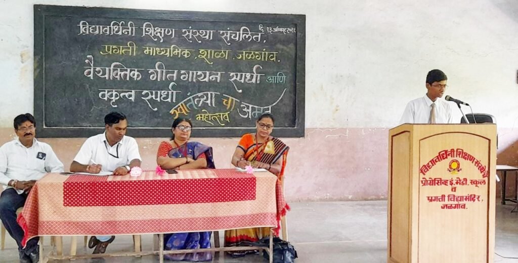 विद्यावर्धिनी शिक्षण संस्थेने चालवलेले प्रगती प्राथमिक व माध्यमिक शाळेत स्वातंत्र्याचा अमृत महोत्सवानिमित्त विद्यार्थ्यांमध्ये देशभक्ती, राष्ट्रीय प्रेम निर्माण व्हावे या उद्देशाने शाळेत वकृत्व व गीत गायन स्पर्धेचे आयोजन करण्यात आले. स्पर्धेत जास्तीत जास्त विद्यार्थ्यांना संधी व सहभाग देण्यात आला. विद्यार्थ्यांनी उत्तम असे सादरीकरण केले.