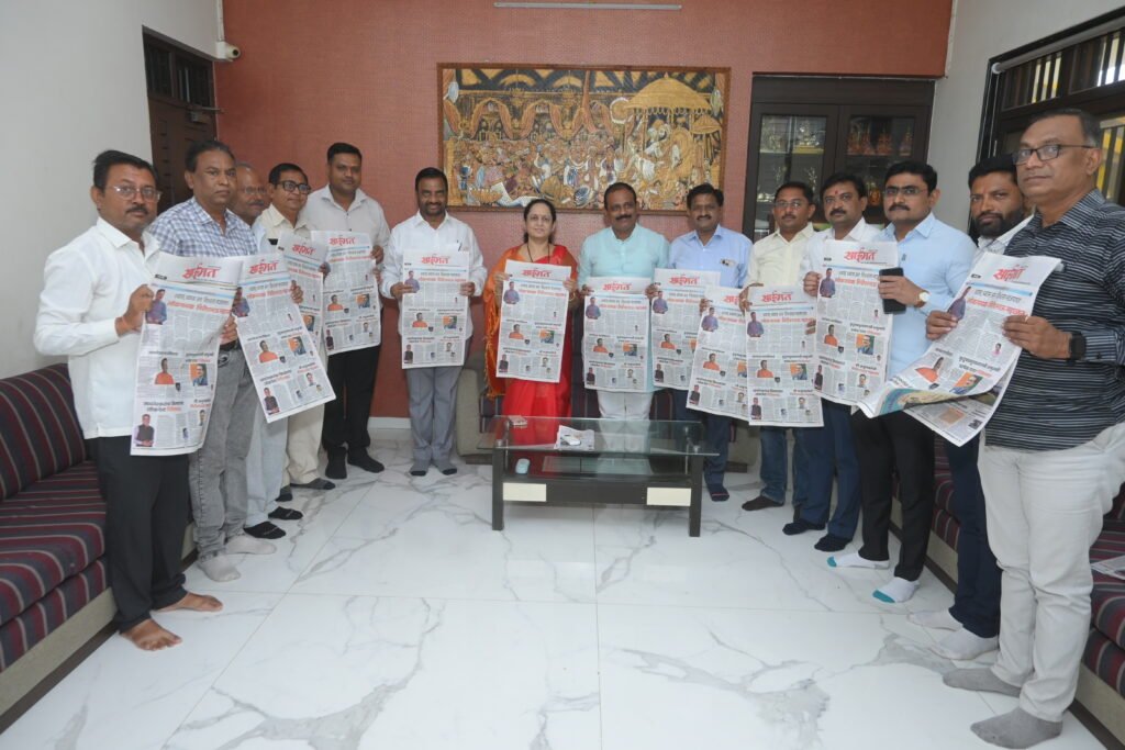 राज्याचे मंत्री ना.गिरीशभाऊ महाजन यांच्या वाढदिवसानिमित्त शनिवारी, १७ मे रोजी त्यांच्या निवासस्थानी दैनिक ‘साईमतच्या’ अभीष्टचिंतन विशेष पुरवणीचे प्रकाशन माजी नगराध्यक्षा साधनाताई महाजन यांच्या हस्ते करण्यात आले. याप्रसंगी संपादक प्रमोद बऱ्हाटे, कार्यकारी संपादक सुरेश उज्जैनवाल, वृत्त संपादक छगनसिंग पाटील यांची प्रमुख उपस्थिती होती. दै.‘साईमतची’ अभीष्टचिंतन विशेष पुरवणी वाचनीय ठरली असल्याच्या प्रतिक्रिया असंख्य उपस्थित मान्यवरांनी दिल्या आहेत.