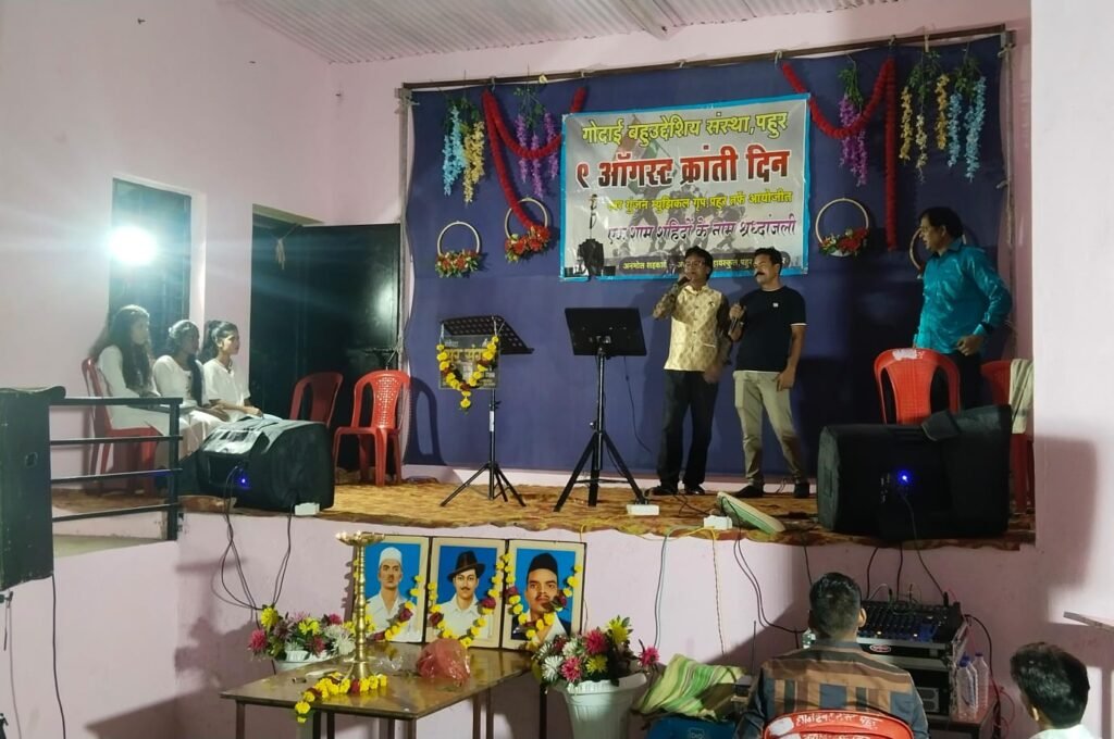येथे ऑगस्ट क्रांती दिनानिमित्त प्रतिवर्षाप्रमाणे गोदाई बहुउद्देशीय संस्थेतर्फे ‘एक शाम शहीदों के नाम’ राष्ट्रभक्तीपर गीत गायनाचा कार्यक्रम पहूर येथील आर.टी. लेले हायस्कुल व कनिष्ठ महाविद्यालयाच्या सांस्कृतिक सभागृहात घेण्यात आला. कार्यक्रमात प्रारंभी क्रांतिकारी भगतसिंग, सुखदेव व राजगुरू यांच्या प्रतिमांचे पूजन करण्यात आले. यावेळी स्वातंत्र्य लढ्यात प्राणार्पण केलेल्या शहिदांना अभिवादन केले. स्वर गुंजन म्युझिकल ग्रुपतर्फे विविध राष्ट्रभक्तीपर गीत सादर करण्यात आले. राष्ट्रभक्तांनी सादर केलेल्या गीतांनी सारेच वातावरण मंत्रमुग्ध झाले होते.