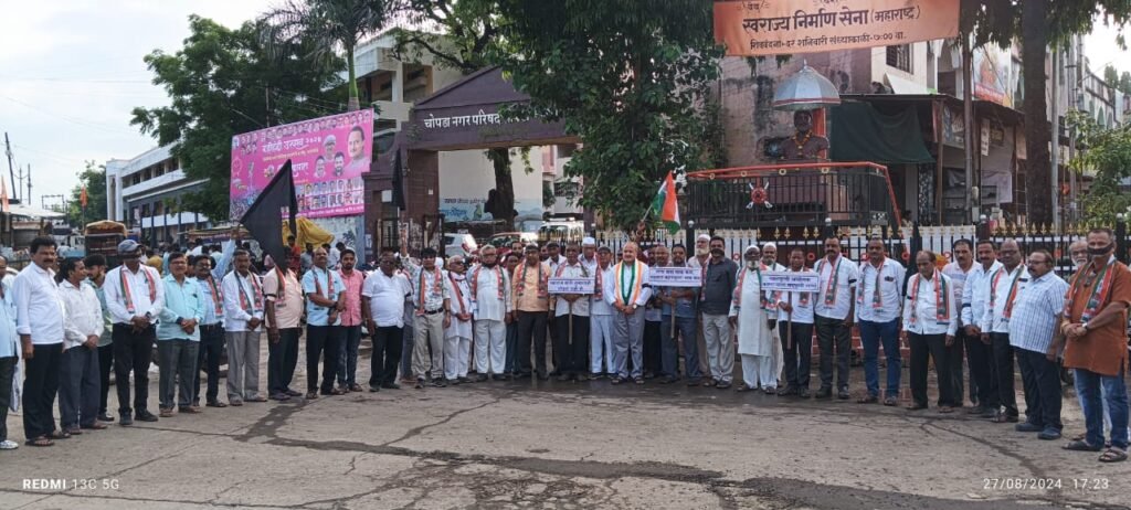 सिंधुदुर्ग जिल्ह्यातील मालवण येथील छत्रपती शिवाजी महाराजांचा पूर्णाकृती पुतळा केवळ आठ महिन्यातच कोसळल्याने संबंधित घटनेला जबाबदार अधिकारीच नव्हे तर सरकारही आहे. त्यामुळे भारतीयांची मान शरमेने खाली झुकली आहे. महाराष्ट्राचा मोठ्या प्रमाणावर अपमान झालेला आहे. म्हणून त्याचा निषेध व्यक्त करण्यासाठी नगरपालिकेजवळील छत्रपती शिवाजी महाराज चौकात मंगळवारी, २७ ऑगस्ट रोजी सायंकाळी भारतीय राष्ट्रीय काँग्रेस (आय) पक्षाच्यावतीने सर्व नेते, पदाधिकारी, कार्यकर्ते यांनी निषेध मूक आंदोलन केले. यावेळी काळ्या फिती लावून हातात काळे झेंडे घेऊन निषेध व्यक्त करण्यात आला.