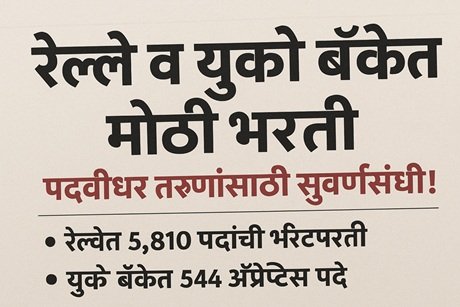 रेल्वे आणि युको बँकेतील ही दुहेरी भरती मोहीम देशभरातील पदवीधर तरुणांसाठी स्थिर व सुरक्षित करिअरची सुवर्णसंधी ठरत आहे.