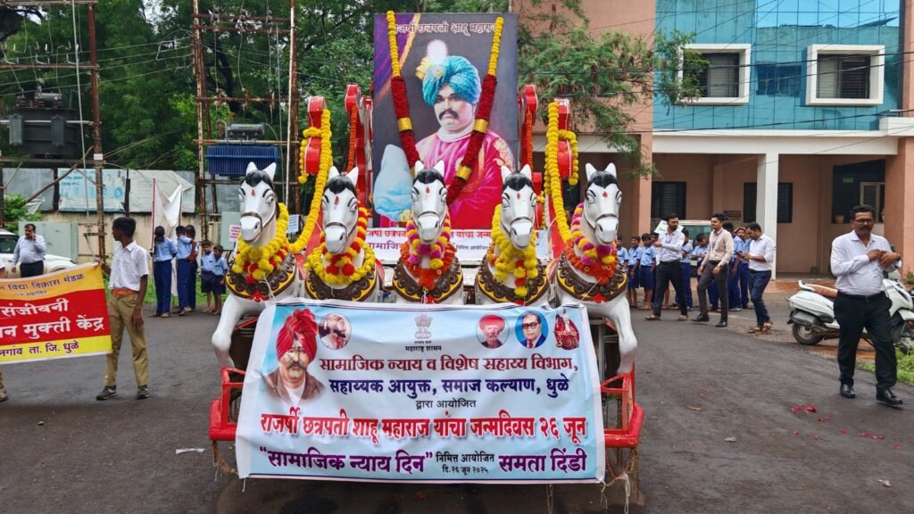 राजर्षी छत्रपती शाहू महाराज यांच्या जयंतीनिमित्त २६ जून हा दिवस सामाजिक न्याय दिन म्हणून साजरा करण्यात येतो. या दिनाचे औचित्य साधून समाजकल्याण विभागामार्फत काढण्यात आलेल्या समतेचा संदेश देणाऱ्या समता दिंडीस उत्स्फूर्त प्रतिसाद लाभला. सुरुवातीला छत्रपती शाहू महाराजांच्या प्रतिमेचे पूजन करुन अभिवादन करण्यात आले. त्यानंतर अपर जिल्हाधिकारी सुभाष बोरकर तसेच मान्यवरांनी हिरवी झेंडी दाखवून समता दिंडीची सुरुवात करण्यात आली. तसेच संविधानाच्या उद्देशिकेचे सामूहिक वाचन करण्यात आले.