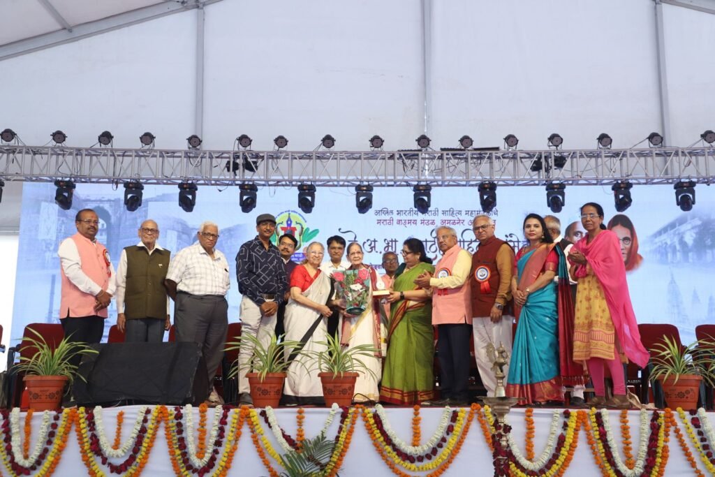 यावेळी साने गुरूजी यांच्या पुतणी सुधा साने यांचा लोकसभेच्या माजी सभापती सुमित्रा महाजन यांच्या हस्ते सत्कार करण्यात आला. सत्काराला उत्तर देतांना सुधा साने यांनी मनोगत व्यक्त केले. त्या म्हणाल्या की, १९२३ मध्ये जुलै महिन्यात गुरूजींनी अमळनेरच्या मातीत पहिले पाऊल टाकले. ते खान्देशाच्या मातीत एकरूप झाले. त्यांनी कामगारांना न्याय मिळावा म्हणून लढे उभारले. त्यांनी ५० वर्षांच्या आयुष्यातील साडे आठ वर्ष तुरुंगात काढले. तसेच साहित्याचे विविध प्रकार हाताळले. त्यांनी १९२४ मध्ये प्रथम पुस्तक लिहिले. तसेच १०० हून अधिक पुस्तके लिहिली. त्यांच्या कर्मभूमीत ९७ वे अखिल भारतीय मराठी साहित्य संमेलन होत आहे, त्याचा मला विशेष आनंद होत आहे. त्यांच्या कामांची दखल घेतल्याने त्यांचा गौरव झाल्याचे समजते, असेही त्या म्हणाल्या.