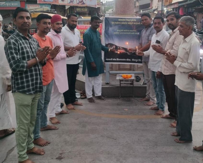 गुजरातमधील अहमदाबादहून लंडनकडे जाणाऱ्या एअर इंडियाच्या विमानाचा १२ जून रोजी अपघात होऊन दोनशेंच्यावर प्रवाशांसह अन्य नागरिकांचा मृत्यू झाला आहे. अशा सर्व निष्पाप नागरिकांना शिरपूर शहरातील विजयस्तंभ परिसरातील व्यापाऱ्यांनी तीव्र शोक व्यक्त करुन मृतांना रविवारी, १५ जून रोजी सायंकाळी आदरांजली वाहिली.