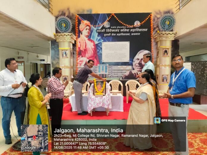 येथील खान्देश कॉलेज एज्युकेशन सोसायटी संचालित स्वामी विवेकानंद कनिष्ठ महाविद्यालयात संतश्रेष्ठ ज्ञानेश्वर महाराजांची सप्त शतकोत्तर सुवर्ण महोत्सवी जयंती गुरुवारी, १४ ऑगस्ट रोजी मोठ्या उत्साहात साजरी करण्यात आली. यावेळी सर्वप्रथम संत ज्ञानेश्वरांच्या प्रतिमेसह ज्ञानेश्वरी ग्रंथाचे पूजन करण्यात आले. त्यानंतर सर्व शिक्षकांनी पसायदानाचे सामूहिक गायन केले. प्रा.रूपम निळे यांनी पसायदान गायन केले तर प्रा.संध्या महाजन यांनी पसायदानाचा अर्थ स्पष्ट करून देताना संत परंपरेतील संत ज्ञानेश्वरांचे स्थान किती मोठे आहे हे सांगताना त्यांचे चरित्र श्रोत्यांना उलगडून सांगितले. अध्यक्षस्थानी उपप्राचार्य प्रा.आर.बी.ठाकरे होते.