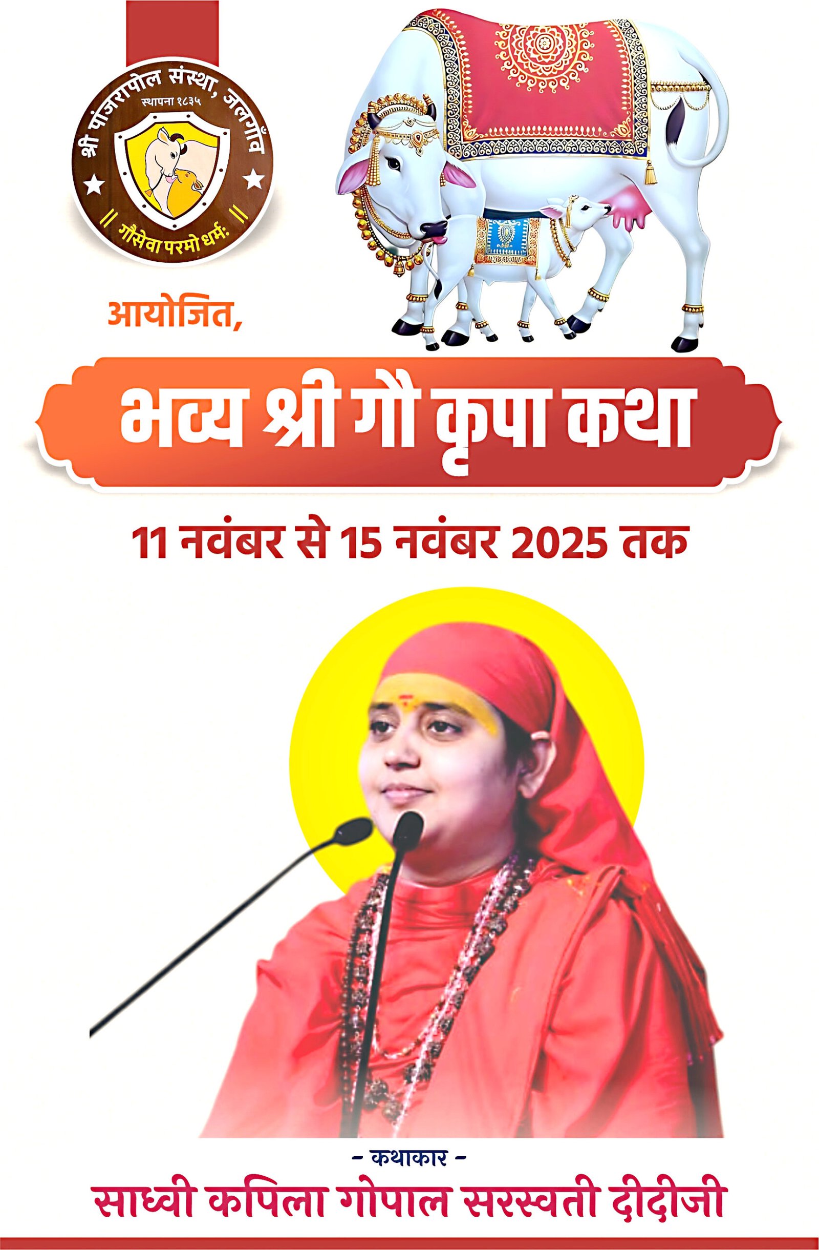 भारतीय सनातन संस्कृतीत पवित्रतेचे आणि मातृत्वाचे प्रतीक मानल्या जाणाऱ्या गौमातेची सेवा सर्वश्रेष्ठ मानली जाते. धार्मिक तसेच वैज्ञानिक दृष्टिकोनातूनही गोवंशाचे महत्त्व अधोरेखित करणारी ‘श्री गौ कृपा कथा’ भव्य धार्मिक कथा ११ ते १५ नोव्हेंबरदरम्यान आयोजित केली आहे. ही कथा श्री पांजरापोळ ‘गौतिर्थ’ संस्थेतर्फे, नेरी नाक्याजवळील पांजरापोळ प्रांगणात दररोज दुपारी ३ ते सायंकाळी ६ या वेळेत आयोजित केली आहे.