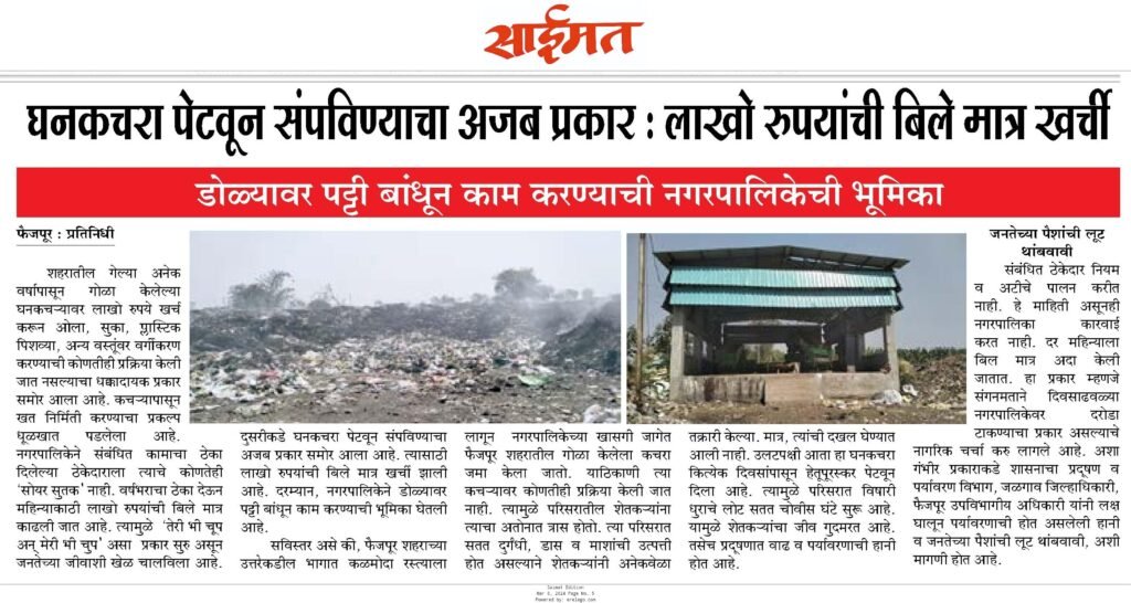नगरपालिकेतील घनकचरा व्यवस्थापनाच्या गलिच्छ कारभाराबाबत शुक्रवारी ८ मार्च रोजी दैनिक ‘साईमत’ने ‘घनकचरा पेटवून संपवण्याचा अजब प्रकार : लाखो रुपयांची बिले मात्र खर्ची… डोळ्यावर पट्टी बांधून काम करण्याची नगरपालिकेची भूमिका’ अशा ठळक मथळ्याखाली वृत्त प्रकाशित केले होते. या वृत्तामुळे नगरपालिका गोटात खळबळ उडाली होती. तसेच नागरिकांनी वृत्ताचे स्वागत केले. त्यात फैजपूर नगरपालिकेला कायमस्वरूपी मुख्याधिकारी नसल्याने प्रभारीराज सुरू आहे. प्रत्यक्ष केलेल्या कामाची शहानिशा व चौकशी न करता घाईगर्दीत बिल मंजूर केले जात असल्याने भ्रष्टाचार बोकाळला आहे.